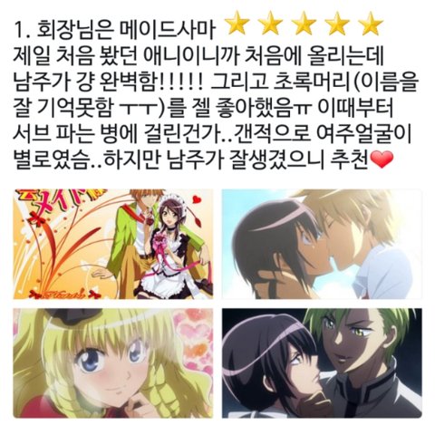 존잘이지 ㅠㅠㅠ 여주남주 이쁜거 좋은데 이 애니가 그럼! 약간 회장님은 메이드사마 우스이 닮아서 봤는데 스토리 탄탄하고 좋아!