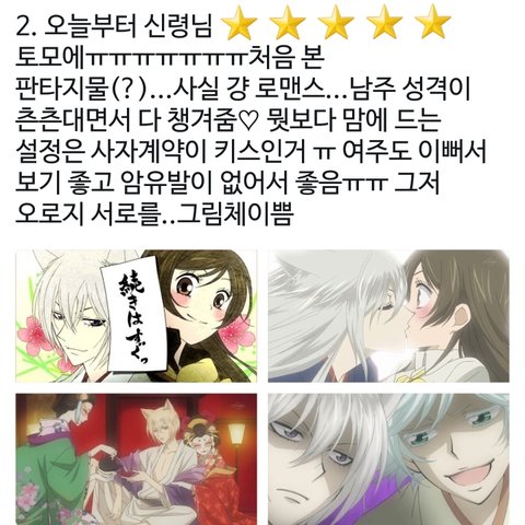 +이건 정말 명작이야ㅠㅠ 2기 오프닝 개씐남 그리고 1기오프닝도 좋고 토모에가 너무 좋아 ㅜㅜㅜㅜ 엄청 달달한데 오글거리진않고 재밌음♡