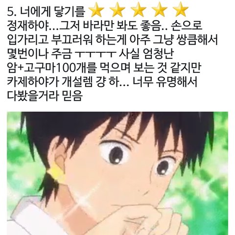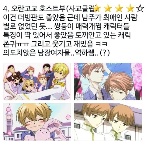 + 갓오하!! 진짜 명작이야 만화책으로도 보는 거 진짜진짜 추천 왜냐면 1기밖에 안나와서 애니엔딩이 끝난게 아님ㅠ 2기 나올것처럼 굴어놓고 나온게 없음 ㅠㅠㅠ 꼭 봐 진짜! 처음에 올린 움짤이 여기서 나오는 서브남주야!!! 그리고 오프닝 명곡임!!!! 안본사람 없음 좋겠다 ㅠㅠㅠ 만화책도 진짜....ㅠㅠ 영화는 캐스팅이 그런데 서브남주 싱크는 좋음..ㅎ