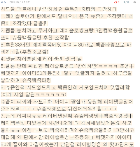 170408 방송달리다 레이소감병크터짐->8명 이간질 새벽4시까지 추천20씩 조작하며 베톡도배해 병크 묻음 170716 레이솔로병크 떠서 커뮤뒤집힘->판만조용. 라창이 애들 티저 조회수 조작자료 만들어서 베톡조작하고 뿌림. 레이관련 댓글 올라오자 아이디80개로 댓 밀고 베톡에서 레이흔적 아예 없앰 170731 오늘 레이유일탑시드홈 닫음->판만 조용. 라창 허위 루머기사 지어내 가져와 뿌림. 베톡조작중. 이번에도 8명 머리채 잡고 루머까지 지어내 뿌리는 패턴. ╋이후 2시간뒤 라창 발작한거 추가. 레이홈은 보다시피 8명 루머글로 베톡 조작해 묻었음음->2시간뒤 8명대포 관련 터지니 바로 10페이지 줌타령 까플도배(라창 타싸에서도 동시에 8명으론 어그로끌었다 지입으로 입텀, 대댓에 캡)