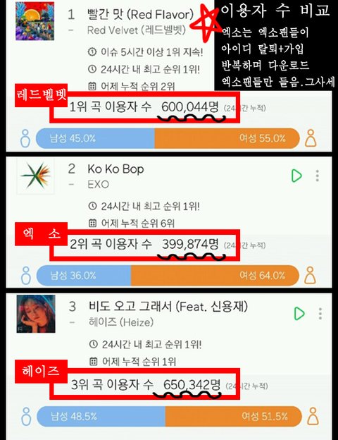 남돌 첫날 이용자수도 올해 하이라이트랑 위너 60만대 다음에 엑소 코코밥 59만8천으로 그다음임 애초에 남돌이 이용자수가 많이 나오는게 아닌데 이걸로 자위하네 2주됬는데 이용자수 40만대정도 나오면 엑소 꽤 선방한거임 오늘보니까 날씨때문에 헤이즈처럼 잔잔한곡 말곤 다 이용자수 떨어지더만
