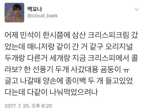 25일자 목격담이고 민석이가 사간건 빨간색 스파이더맨 선풍기래