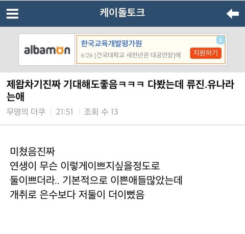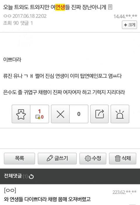 진짜 열폭러들 이것도 비추 테러ㅋㅋㅋ 여성 인권 타령하면서 잘난 애들한테는 심술 부림