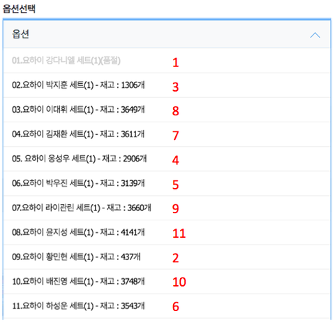 2. 요하이 멤버별 재고 순위 - 8/1 00시부터 판매 시작. 강다니엘은 해뜨기전에 품절