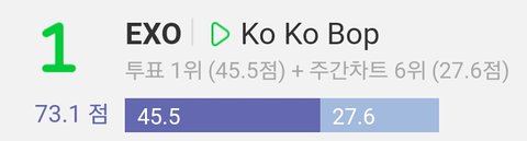 현재 엑소는 이번 컴백 첫주에 코코밥으로 주간인기상 딱 한번 1위 찍은거+폴랖점수 조금 들어가서 135.7점임.