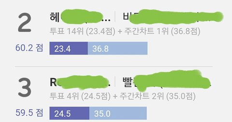 니네도 알다시피 솔직히 이 셋중 우리가 투표로는 확실히 셈. 근데 음원만으로도 2,3위 가수는 저정도 점수 받았고, 특히 2위가수는 팬덤빨이라고 할 수 있는 투표에서 약한데도 비교적 팬덤쎈 3위가수 제치고 2위 먹음.