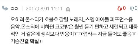 몬스터=전형적 에셈 퍼포먼스노래 라고 만들고 코코밪은 세련되고 듣기좋은데 반응없다고 만들고있잖앜ㅋㅋㅋㅋㅋㅋㅋㅂㅁㄱ위에 댓달지말라고 죽여버린다__좀