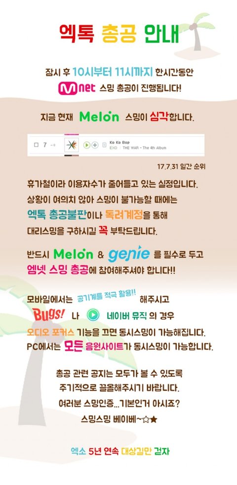 총대 없이도 다들 알아서 독려 잘해주고 암넷스밍 총공시간은 10시가 나은거 같음 어제보다는 화력도 괜찮았고 결국엔 코코밥도 순위상승했고! 다들 고생했다