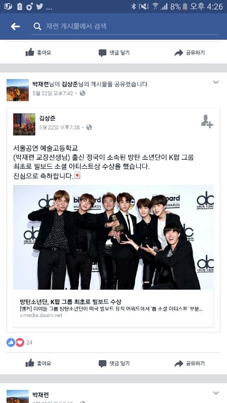 빌보드 상 탔다는 글에 교장선생님 아내 분..? (서1공1예 소장이시래!) 께서도 댓글에 축하해주시고ㅋㅋㅋㅋㅋ 너무 따뜻하다ㅠㅠㅠㅠ