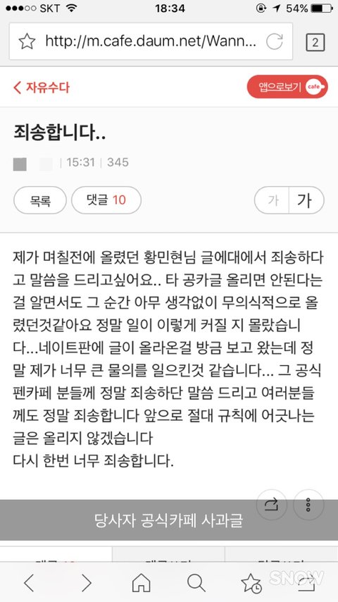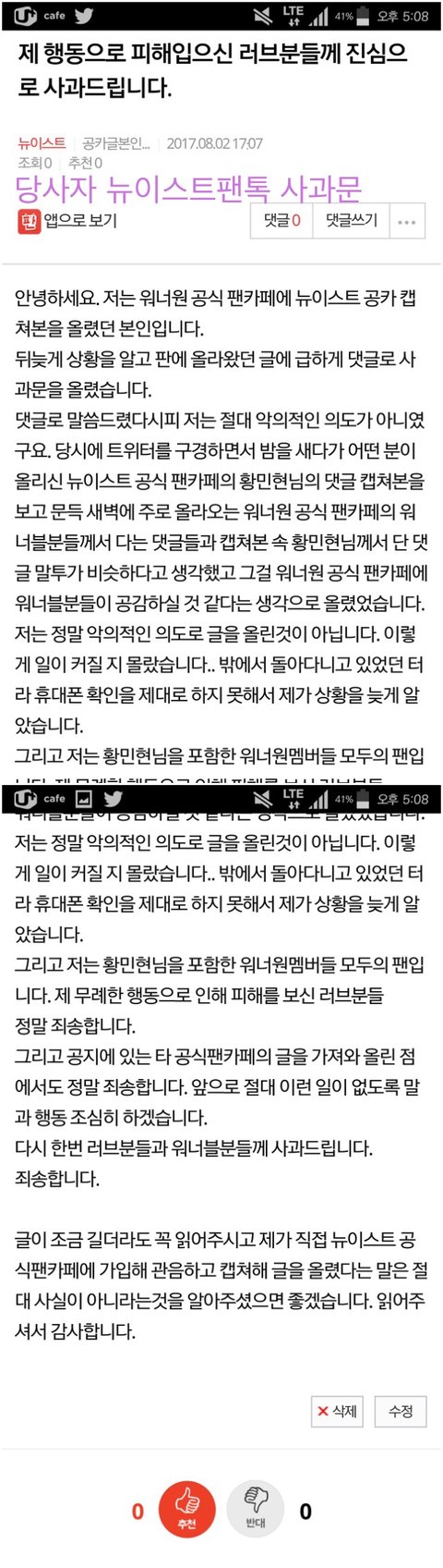(해당 뉴이스트 팬톡에 올린 사과문은 당사자가 기재한 글의 캡쳐본입니다.)