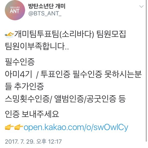 개.미팀 투표 팀 모집하고 있어 인원 부족해 하나도 안 어려우니까 제발 많이 참여해줘