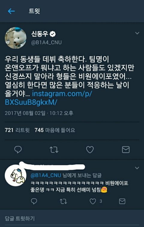 그리고 선배인 B1A4 멤버들이 홍보&응원글들을 올려줌