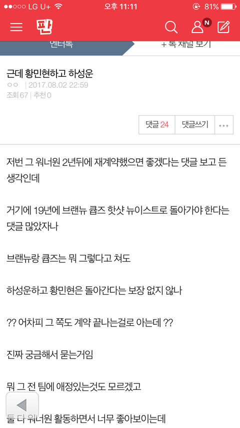 진짜 쟤한테 뉴이스트 영상 보여주고싶다 애정이 없긴 뭐가 없어 진짜 빡쳐 ㅠㅠ 댓글 달고싶어도 못다니까 팬톡에다라도 풀어야겠어!! (비속어비속어) 안그래도 요몇일 계속 저런 비슷한글 올라와서 기분 짜증나는데... (;o;)