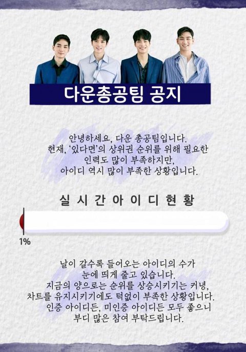 러브들 ㅁㄹ아이디 많이 보내고 잇는거 아는데 좀만 더 기운내자 ㅠㅠ 타싸하는 러브 잇으면 전파좀 해줘 총공팀 계속 아이디 없어서 힘드시대