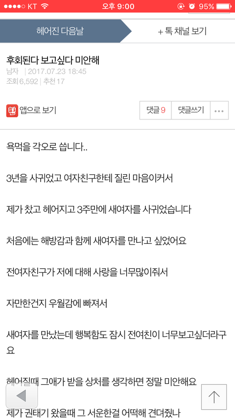 이제 한달 지남 한번도 안잡아준 그사람이 너무나 미웠음 하지만 나는 나를 사랑하지 않는 사람을 놓친거지만 그사람은 자기자신을 사랑해..