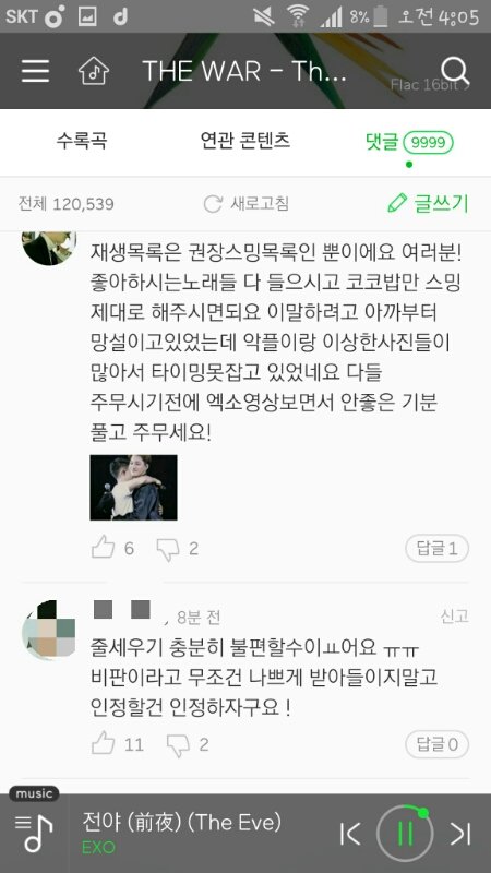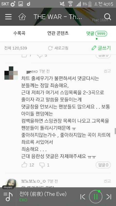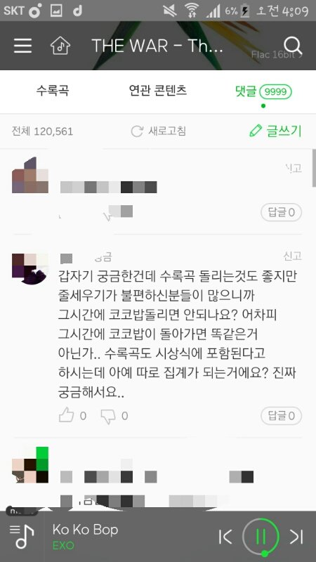 오늘 새벽에 더워 앨범 댓글창 보다가 닉네임눌러봐도 거의다 코코밥스트리밍 2000번정도되는 엑소엘이였는데 저런말이있어서..그리고 줄세우기 불편하다는 사람들은 왜그러는거임?닉네임은 가려야될것같아서 가림(스밍공기계)