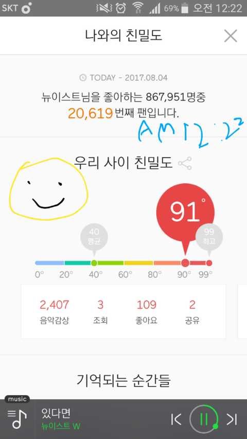 친구가 이상한 눈으로 봤꼬ㅠ요즘 맨날 한 시간 마다 수박차트 확인하고 24시간 스밍한다꼬☺ 하루하루 뉴잇의 회전문에 치이고.. 일코하기 너무 힘들다꼬 꼬이꼬이