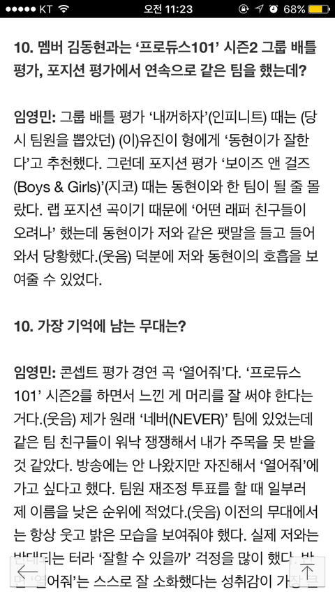 그리고 인텁보다 궁금한게생김 ㅎ 동동이는 분명 보컬라인듯 한데 보앤걸때 파트경연에서 왜 랩파트로 온걸까??? ㅎ 영민이 따라서 간건 아닐테구...븨앱때 물어보고싶다 ㅎ