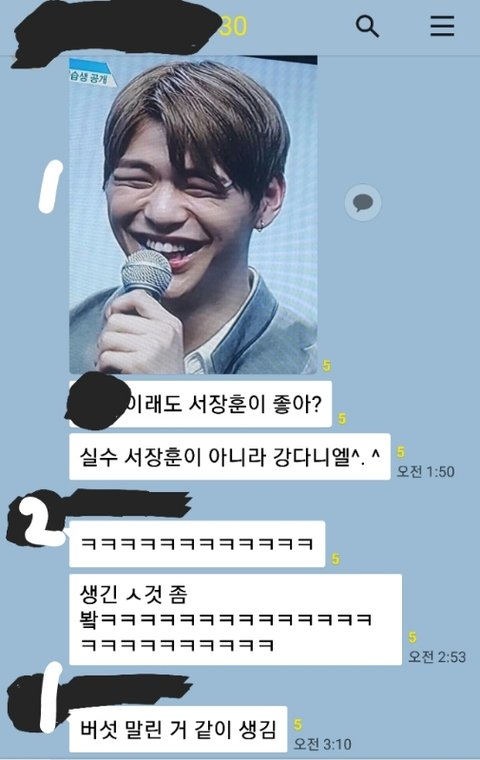 여고에 재학중인 학생입니다 여고에 다니고있는만큼 워너원이라는 친구들이 저희의 큰 화제죠 워너원 모두 좋아하는 친구들도 있고 아니면 그중 한두명을 집중적으로 파는 친구들이 있어요 저는 워너원이라는 그룹이 만들어지는건 알고있지만 딱히 큰 관심은 가지고있지 않은 사람입니다 그런데 저희반에서 실세들(흔히 입 잘터는 애들)은 유독 강다니엘을 싫어하더라고요 뭐 싫어하고 좋아하고는 개인적인 취향이니까 뭐 그러려니 했는데 강다니엘 좋아하는 애를 무시하고 왜 저런애 좋아해? 이런식으로 말하는걸보고 정이 확 떨어지더라고요 그러고 있는 와중에 어제 저희반 단톡에 톡이왔는데 사진에있는식으로 왔더라고요 저걸 보고나서 진짜 강다니엘한테 큰 관심도 없는 저조차도 기분이 팍 상하더라고요 강다니엘 좋아하는 애한테 대놓고 저렇게 말하는게 맞는상황일까요 저는 저 실세들과 친하다고는하지만 저런행동을 하지말라고 말을 못합니다 아무래도 실세라고 하니까 매장시키는건 한순간이거든요 이 상황 어떻게 해야할까요