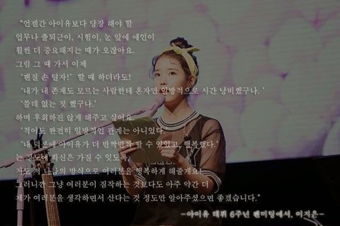 데뷔 초에 강심장?에서 내 팬 가죽이지 않는 가수가 돼야겠다? 이케 말한거랑 평소에 팬들한테 잘하는거 보고 진짜 초심 안잃는다고 생각했었던 찰나에 타아이돌 덕질하는데 아이유가 말한거 보고 디게 감동 먹었었는데 아이유 팬들은 기분 이상하겠다.