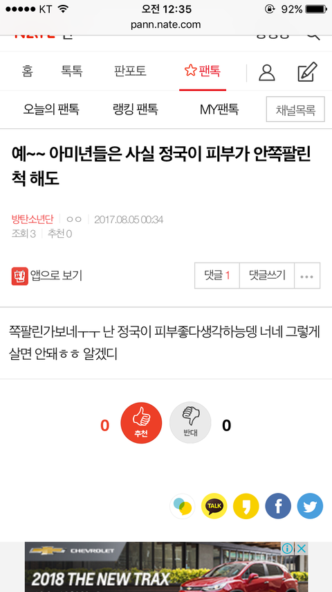 예~~ 아미년들은 사실 정국이 피부가 안쪽팔린 척 해도