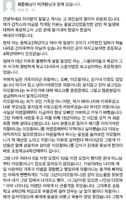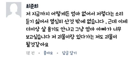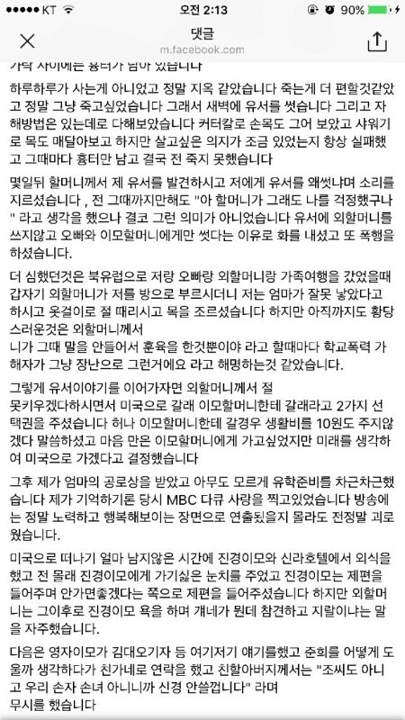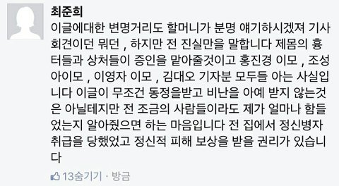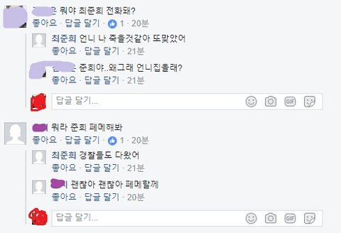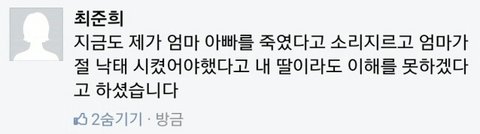 이런거보니 꽤나 심각해보이고 다른연예인,기자도 아는거보면 유명했나봐...현재 페북 탈퇴했는지 안들어가지는데 이거 널리 알리게하자..!준희도 아직 중2밖에 안됬고 얼른 다른곳으로 보호받아야할텐데ㅜㅜ