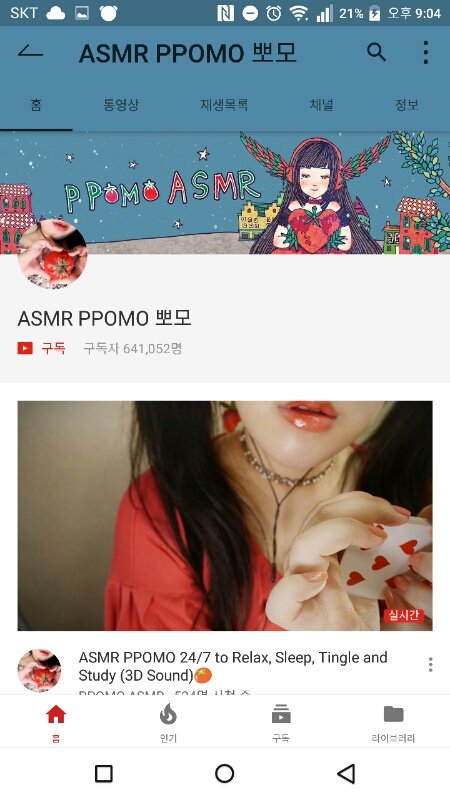 목소리 짱 귀여우심 신혼부부 롤플 달달터지고..아마 여기에 언급된 유튜버분들중 유일하게 하관만 공개하시는 분인듯 또 가장 많은 외국인 구독자를 보유하고 계시지 않을까 (댓글창에서 한국인 찾기가 어려울 정도..) 요즘은 항상 24시간 녹방 하시더라고 뽀모님은 귀마사지 최고존엄 최고최고최고