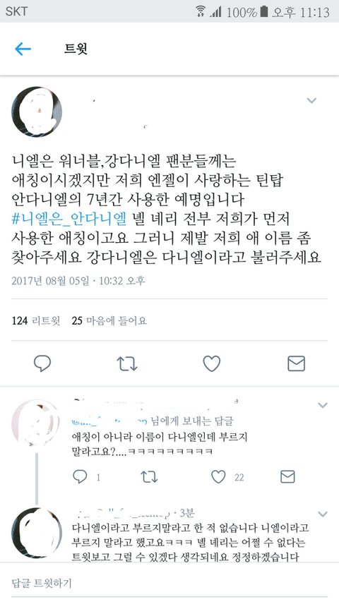 틴탑 팬들은 니엘은 틴탑 멤버 안다니엘의 활동명이고 몇년동안 그렇게 불렀으니 워너원 강다니엘은 니엘이라고 부르지말래.