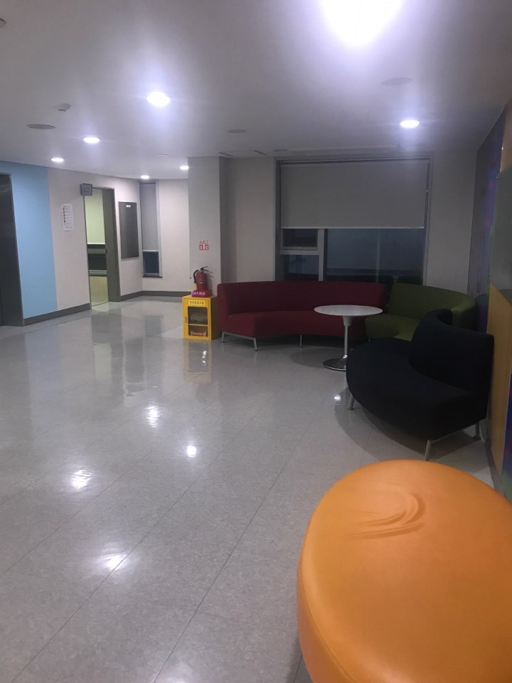 이곳은 층마다 배치된 쇼파와 테이블입니다. 색감이 되게 이쁘네요.