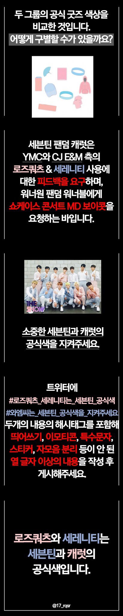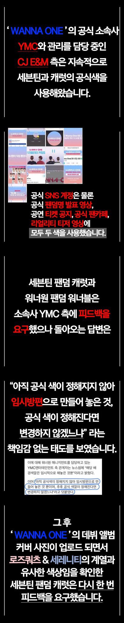 더불어, ㅇㄴㅂ 총대님께서 소속사에 피드백을 요구할 때 보내실 글의 4번째 문단 중 '두 팬덤이 소속사의 피드백에 따랐다' 는 내용 수정해주셨으면 좋겠다는 의견도 많이 나오고 있습니다. 저희 팬덤은 소속사의 피드백에 따르지 않았고, 핑크색과 파란색의 조합 사용 자체를 원치 않았다고 말씀 드립니다.