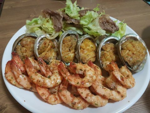 차돌박이 샐러드 & 전복버터구이 & 새우버터구이