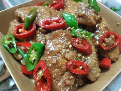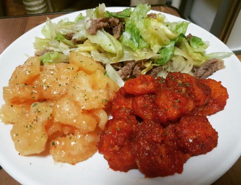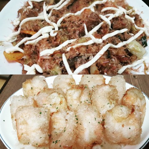 데리야끼목살볶음과 라이스페이퍼 싸서 튀긴 새우튀김