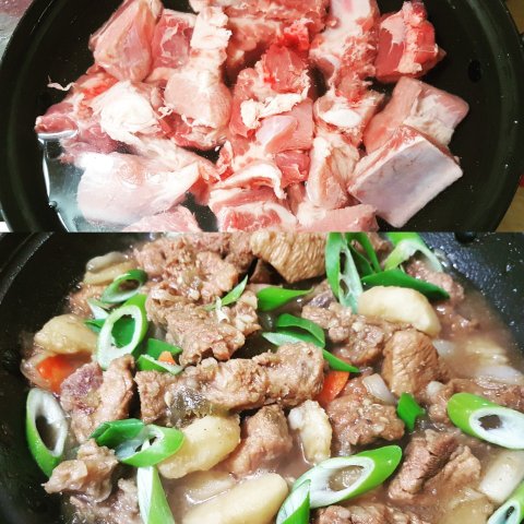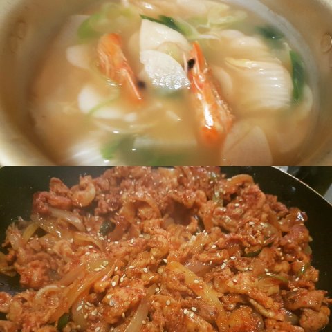 새우머리로 육수낸 어묵탕과 앞다리살로 볶은 제육볶음