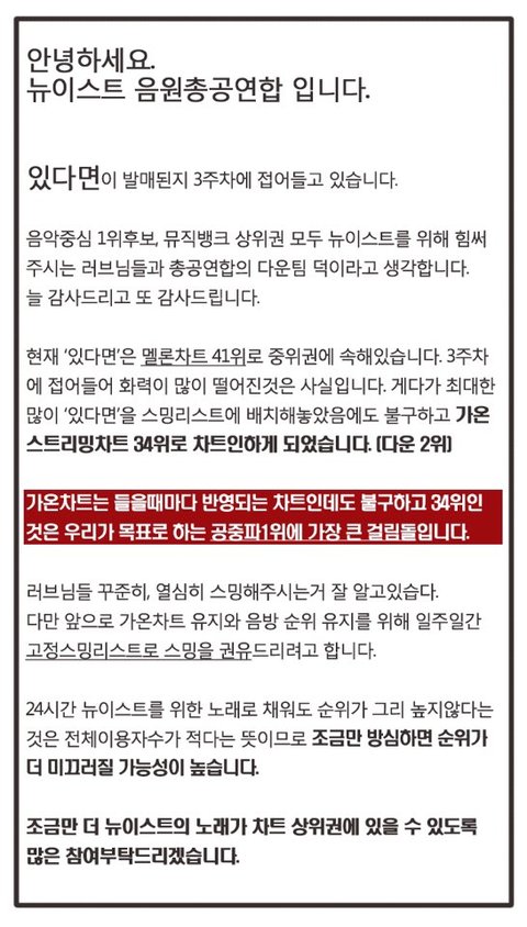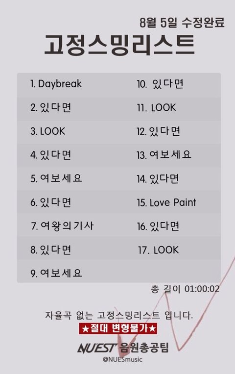 가온차트 유지와 음방 순위 유지를 위해 고정곡들로 스밍리스트를 변경하려고 합니다! 꼭 저 목록대로 들어주시길 부탁드리겠습니다.