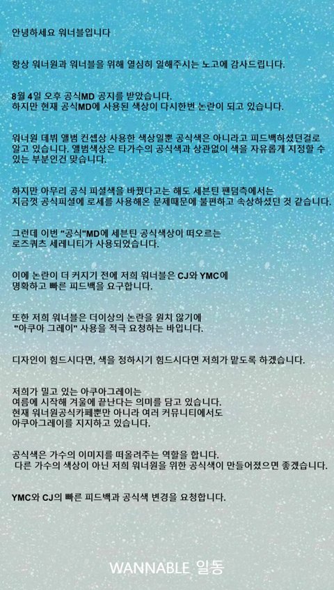 또한 저희 워너블은 더이상의 논란을 원치 않기에 "아쿠아 그레이" 사용을 적극 요청하는 바입니다.