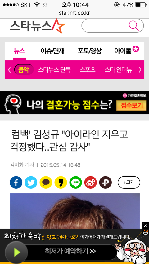 성규.. 아이라인 지우고 걱정했다.. 관심 감사...
