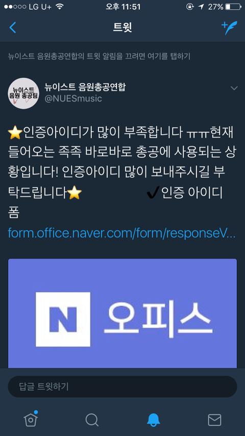⭐️인증아이디가 많이 부족합니다 ㅠㅠ현재 들어오는 족족 바로바로 총공에 사용되는 상황입니다! 인증아이디 많이 보내주시길 부탁드립니다⭐️