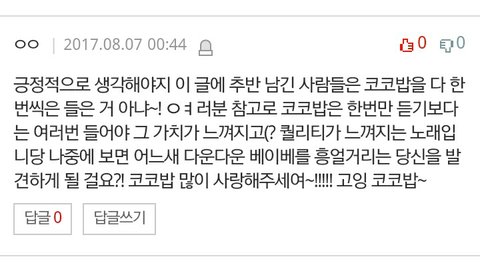 톡선에 코코밥 자기 취향아니라고 노래 어떻냐고 추반 해달라는 글(은근돌려까는)인데 댓글 저렇게 달림ㅋㅋㅋㅋㅋㅋ똥꼬발랄하네