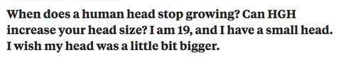 "인간 머리는 언제 성장을 멈춤? HGH 투약하면 머리 사이즈 올릴 수 있음? 나 19살이고 머리가 작음. 머리가 조금 더 컸으면 좋겠어."
