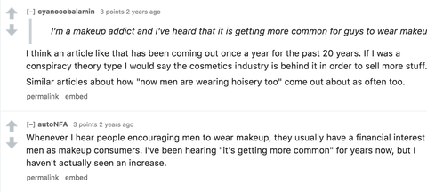 "보통 남자들한테 화장하라고 부추기는 인간들 보면 수익이 있기 때문에 그러는 경우가 많았던거 같음. 지금 몇년동안 숫자가 늘고 있다고 들었지만, 실제로 본적은 없음."