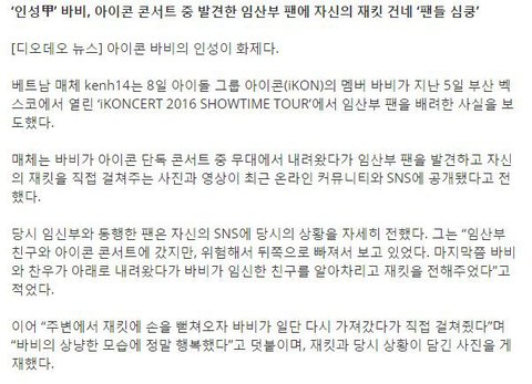 http://www.diodeo.com/news/view/1477954?platform=hootsuitehttps://twitter.com/very_ing/status/706162924767748097콘서트 중 임산부 팬을 발견한 바비는 본인이 입고 있던 자켓을 벗어드렸던 바 있습니다.