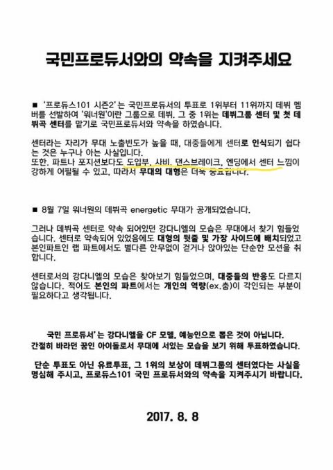 도입부 황민현파트임 근데 파트문제가아니고 그때 센터세워달라한거니까(저 입장문에 따르면^^)