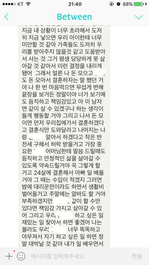모아 놓은 돈이라고는 2천만 원 좀 안되는 돈에, (이걸로 아기와 같이 살 월세 방을 구할 수 있을지나 모르겠습니다) 저희 부모님이나 남자 친구네 부모님이나 경제적으로 도움을 받을 수도 없고, 그렇다고 저희 커플이 번번한 직장이 있는 것도 아닙니다.