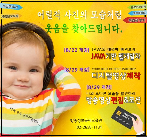 ★ 8/29 개강 :: 생각만해봐~ 표현은 모두 가능하니까~! >>> 과 정 : 방송영상편집&모션 (8/29 개강) <<< * 기 간 : 2017. 8. 29 ~ 2018. 1. 30 * 시 간 : 1일 8시간 / 총 800시간