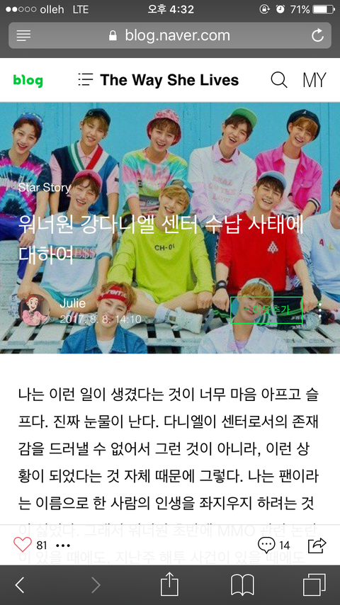 팬들의 이런 반응을 본다면, 다니엘이 어떤 기분일지 대충 짐작이 간다. 어제 2만 명의 팬들과 그토록 꿈에 그리던 데뷔의 순간을 함께 나누며 느꼈던 그 벅찬 감동과 기쁨이 채 가시기도 전에, 전혀 예상하지 못했던 팬들의 이런 불만 섞인 반응에 어리둥절할 것이다. 어쩌면 마음이 아플지도. 그가 기대한 것은 팬들의 축하와 칭찬이었을텐데... 늘 자신이 큰 의미 없이 했던 행동들에 팬들은 큰일 난 것처럼 득달같이 달려드니까. 그게 얼마나 스트레스이고, 얼마나 마음 쓰일까. 그렇게 생각하니 이제 겨우 데뷔한지 하루 지난 아이에게 큰 마음의 짐을 지워주는 것 같아 가슴이 아프고, 그래서 눈물이 나기도 하지만... 이번 일은 반드시 짚고 넘어가야 하는 일이라고 말해주고 싶다. 네가 무얼 하든 그걸 응원해주는 팬들이기는 하지만, 그들도 너에 대한 나름의 꿈과 욕심을 가지고 있다고. 그러니 너도 이번만큼은 팬들의 마음을 헤아려 주어야 한다고.