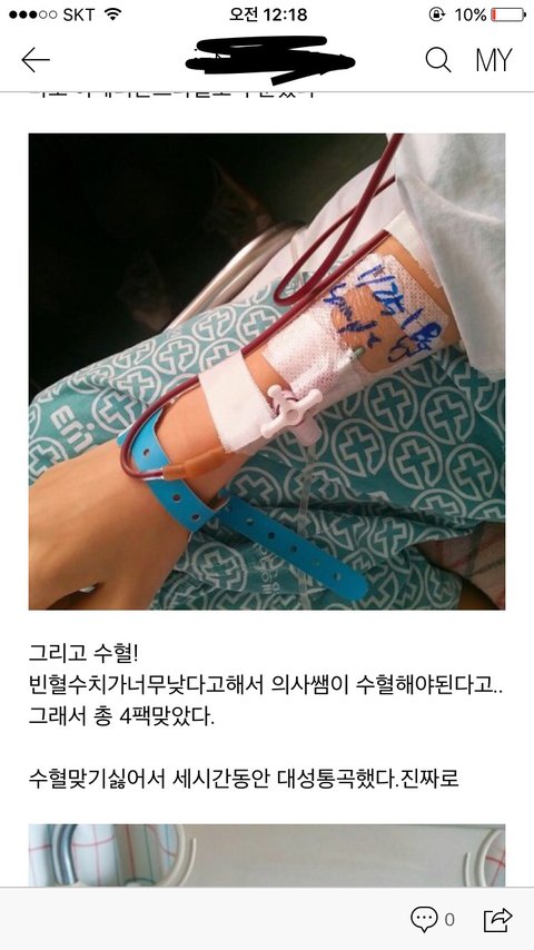 오해는하지말아줘.나는 생리불순으로 하혈을 너무심하게했어.거의 5개월동안 하혈을하다가 빈혈이 너무심하게왔거든 보통 여자 피 수치가12이고 임산부는10~11정도된데.빈혈수치는10이하부터인데 나는5까지 떨어졌거든.두번쓰러졌어 한번은 산부인과에서진료다하고 엘레베이터탈려는데 진짜 숨이안쉬어지고 내가 어디있는지도모르겠고 땀 철철나고 서서히 쓰러졌는데 나중에 엄마 말씀으론 발작도일으켰데.다행히 병원앞에서 쓰러진거라 금방 응급처치했고 바로 응급실에 실려갔었어 그리고 거기서 엑스레이를찍는데 일어서있는게불가능해지고 또 숨이 막히고 쓰러졌어.나중에 결과들으니까 빈혈수치가5라고 심각하다고 바로 입원수속밞고 수혈4팩맞았어