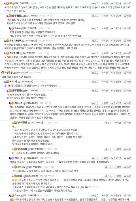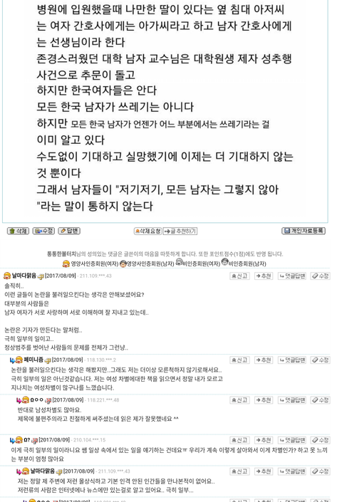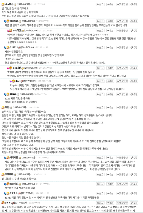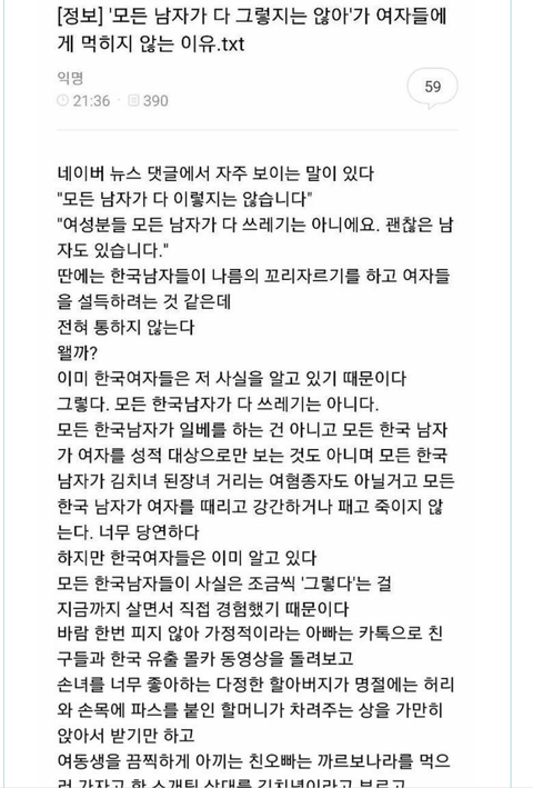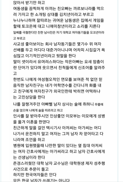 판님들이 생각하는 페미니즘은 무엇이라고 생각해? 요즘사회가 남녀차별이 있는건 맞아 그리고 서로 성차별이 없어지고 평등해야하는건 맞아 근데 전문직이라는 직업을 가진 사람들이페미니즘에 대해 글을 올렸는데..내가 사진을 올릴게..한번 읽어봐..무슨생각이드니?이런사람들이 정상이라고 생각하니? 가만히있는 남자들 모두를 싸잡아 잠재적 범죄자로 만들던데..정말 여기에 좋은쌤들과 제대로된 정상적인 페미니즘을 가진쌤들도 많아 모두 싸잡아서 욕은 하지말아줘.,.하지만 극소수의 여자들..나도 같은여자지만 정말 답이 없어..기가차서 말을못하겠다.. 그럼 우리 아빠랑,오빠, 동생도 싹다 잠재적 범죄자 인건가?.....여기 전문면허직 가진사람들이 무슨생각이나 무슨개념으로 그러는지는 잘모르겠어..내가봐도 이건아닌거 같아...판님들의 의견이 궁금해..