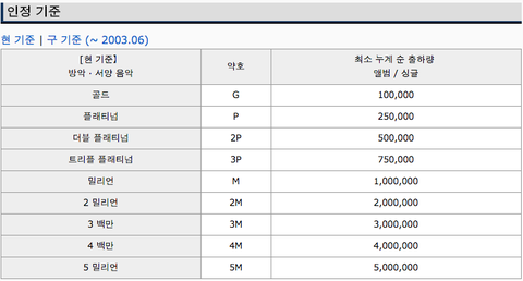 RIAJ(Recording Industry Association of Japan) 당 협회에서는 1989 년 1 월 21 일 이후 발매의 작품에 대하여 발매일부터의 누계 순 출하량이 일정 수를 초과하는 경우 다음의 기준에 따라 골드 디스크 인정을 실시하고 있습니다.