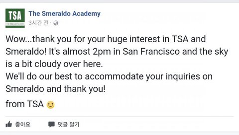 스메1랄도 학회와 스1메랄도에 대한 큰 관심 감사합니다! 샌프란시스코*는 거의 오후 2시이며 현재 이곳의 날씨는 조금 흐리네요.저희는 여러분이 보내주신 스1메랄도에 대한 문의에 최선을 다하려 합니다. 그리고 감사합니다!스메1랄도 학회로부터* 스메1랄도 학회가 세워진 곳(스메1랄도 페이1스북 참고)
