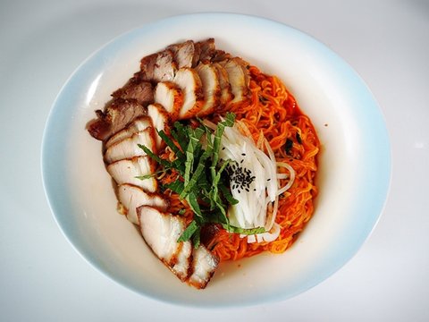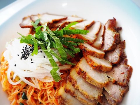 ▶ 비빔면 with 삼겹살광파오븐으로 손님맞이용 삼겹살 보쌈같은 바베큐같은거 하다가 한덩이가 남아서 다음 날 비빔면과 함께 해장용으로, 남은 깻잎과 남은 무채를 활용한 재활용 요리입니다.
